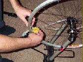 It is best to try and dish the wheel firstly while the spokes are still fairly loose - all you are doing is balancing the hub to the left and right of the centre of the rim. If you use the valve hole as a guide again, put the stick horizontally across the wheel and tighten the gauge onto the locknuts on the drive side.